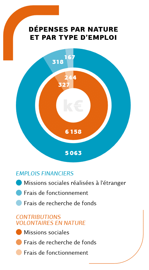 En 2023, 92 % des ressources financières ont été dédiées à la réalisation des missions sociales à l’étranger. Le schéma ci-après illustre les dépenses globales par nature et par type d’emploi.